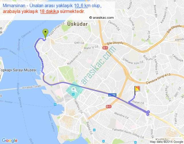 Mimarsinan - Ünalan arası yaklaşık olarak 90 km/h ile yukarıda belirtilen sürede olup, iki yerin kuş uçuşu uzaklığı (mesafesi) 5'dir. Yolculuk otobüsle 23 dakika sürmektedir.
