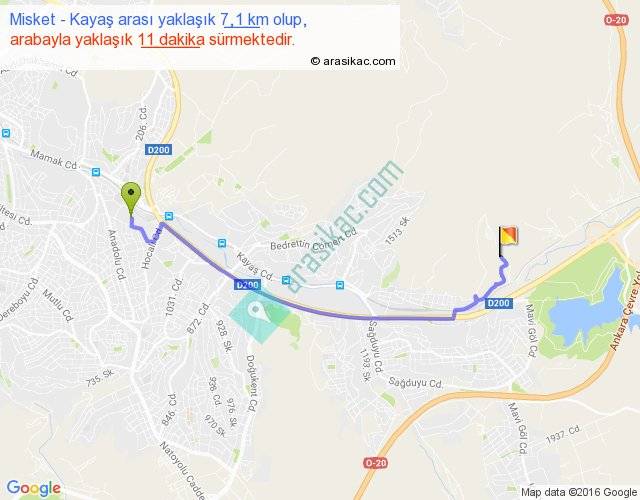 Misket - Kayaş arası yaklaşık olarak 90 km/h ile yukarıda belirtilen sürede olup, iki yerin kuş uçuşu uzaklığı (mesafesi) 5'dir. Yolculuk otobüsle 14 dakika sürmektedir.