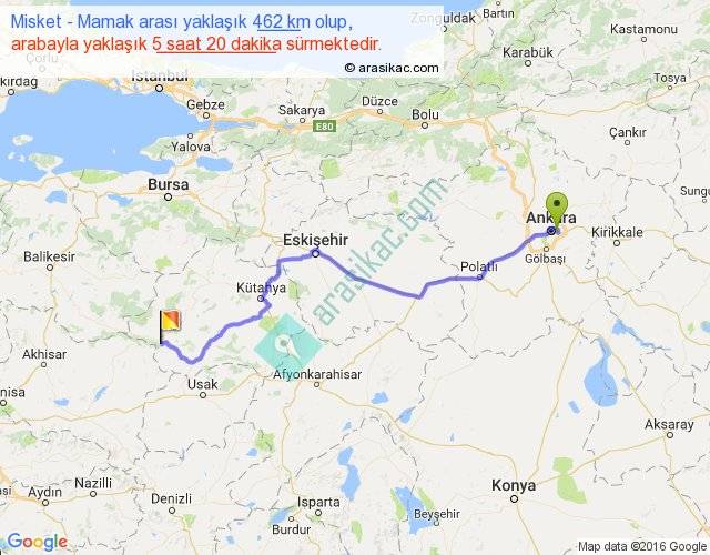 Misket - Mamak arası yaklaşık olarak 90 km/h ile yukarıda belirtilen sürede olup, iki yerin kuş uçuşu uzaklığı (mesafesi) 347'dir. Eğer belirtilen yerler arasında uçak seferi var ise bu süre uçakla 32 dakika'ya kadar düşebilir. Yolculuk otobüsle 6 saat 56 dakika sürmektedir.