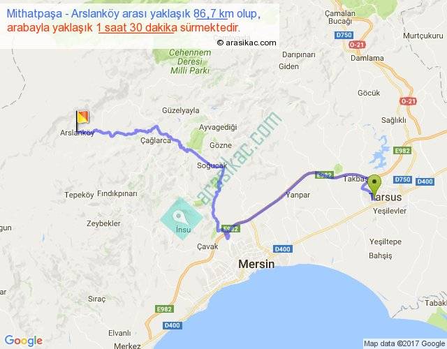 Mithatpaşa - Arslanköy arası yaklaşık olarak 90 km/h ile yukarıda belirtilen sürede olup, iki yerin kuş uçuşu uzaklığı (mesafesi) 53'dir. Yolculuk otobüsle 1 saat 57 dakika sürmektedir.