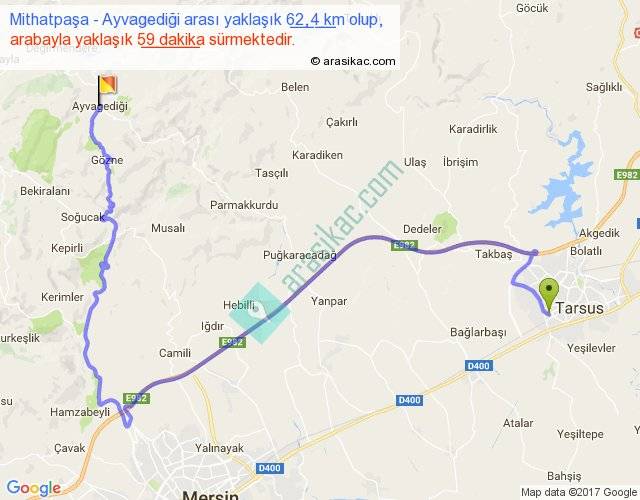 Mithatpaşa - Ayvagediği arası yaklaşık olarak 90 km/h ile yukarıda belirtilen sürede olup, iki yerin kuş uçuşu uzaklığı (mesafesi) 30'dir. Yolculuk otobüsle 1 saat 16 dakika sürmektedir.