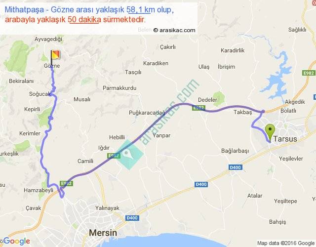 Mithatpaşa - Gözne arası yaklaşık olarak 90 km/h ile yukarıda belirtilen sürede olup, iki yerin kuş uçuşu uzaklığı (mesafesi) 28'dir. Yolculuk otobüsle 1 saat 5 dakika sürmektedir.