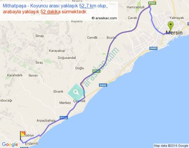 Mithatpaşa - Koyuncu arası yaklaşık olarak 90 km/h ile yukarıda belirtilen sürede olup, iki yerin kuş uçuşu uzaklığı (mesafesi) 38'dir. Yolculuk otobüsle 1 saat 7 dakika sürmektedir.