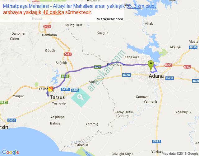Mithatpaşa Mahallesi - Altaylılar Mahallesi arası yaklaşık olarak 90 km/h ile yukarıda belirtilen sürede olup, iki yerin kuş uçuşu uzaklığı (mesafesi) 41'dir. Yolculuk otobüsle 59 dakika sürmektedir.