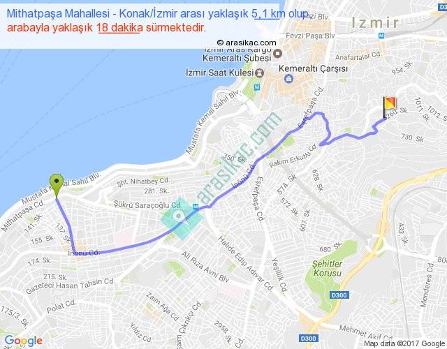 Mithatpaşa Mahallesi - Konak İzmir arası yaklaşık olarak 90 km/h ile yukarıda belirtilen sürede olup, iki yerin kuş uçuşu uzaklığı (mesafesi) 4'dir. Yolculuk otobüsle 23 dakika sürmektedir.