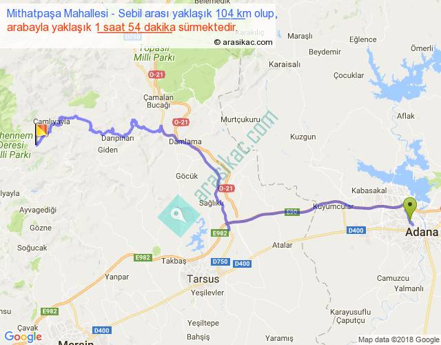 Mithatpaşa Mahallesi - Sebil arası yaklaşık olarak 90 km/h ile yukarıda belirtilen sürede olup, iki yerin kuş uçuşu uzaklığı (mesafesi) 67'dir. Yolculuk otobüsle 2 saat 28 dakika sürmektedir.