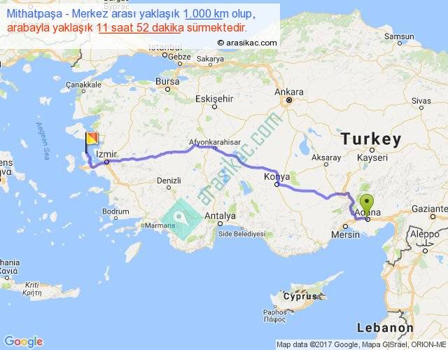 Mithatpaşa - Merkez arası yaklaşık olarak 90 km/h ile yukarıda belirtilen sürede olup, iki yerin kuş uçuşu uzaklığı (mesafesi) 788'dir. Eğer belirtilen yerler arasında uçak seferi var ise bu süre uçakla 1 saat 12 dakika'ya kadar düşebilir. Yolculuk otobüsle 15 saat 25 dakika sürmektedir.