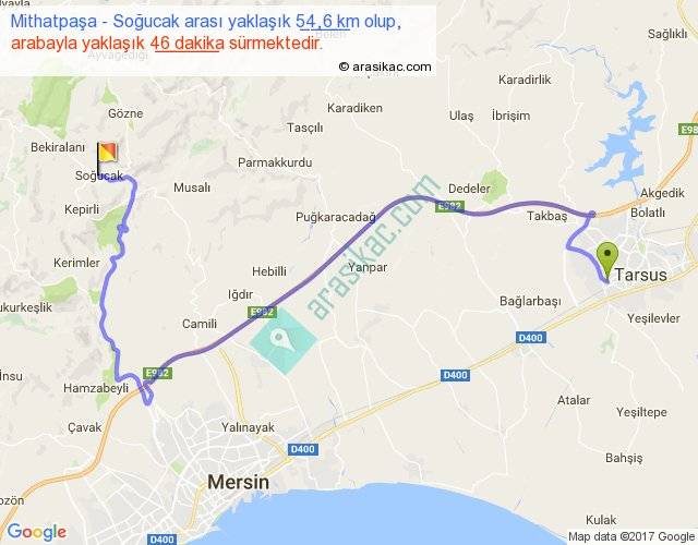 Mithatpaşa - Soğucak arası yaklaşık olarak 90 km/h ile yukarıda belirtilen sürede olup, iki yerin kuş uçuşu uzaklığı (mesafesi) 29'dir. Yolculuk otobüsle 59 dakika sürmektedir.