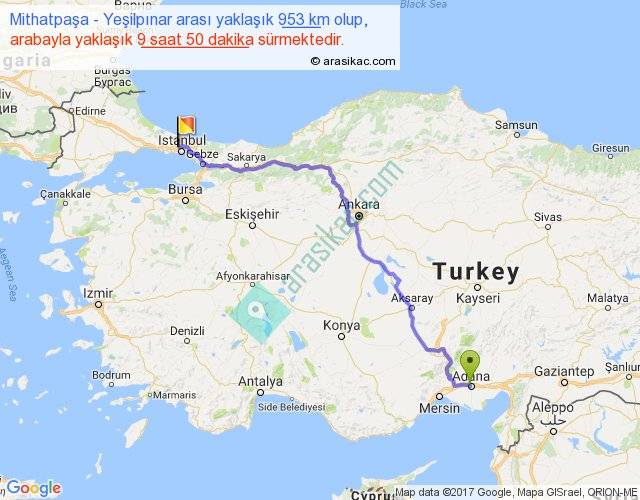 Mithatpaşa - Yeşilpınar arası yaklaşık olarak 90 km/h ile yukarıda belirtilen sürede olup, iki yerin kuş uçuşu uzaklığı (mesafesi) 709'dir. Eğer belirtilen yerler arasında uçak seferi var ise bu süre uçakla 1 saat 05 dakika'ya kadar düşebilir. Yolculuk otobüsle 12 saat 47 dakika sürmektedir.