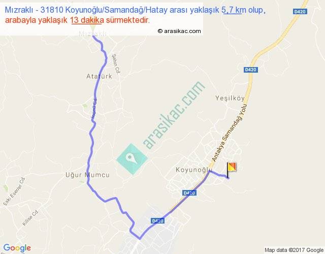 Mızraklı - 31810 Koyunoğlu Samandağ Hatay arası yaklaşık olarak 90 km/h ile yukarıda belirtilen sürede olup, iki yerin kuş uçuşu uzaklığı (mesafesi) 3'dir. Yolculuk otobüsle 16 dakika sürmektedir.