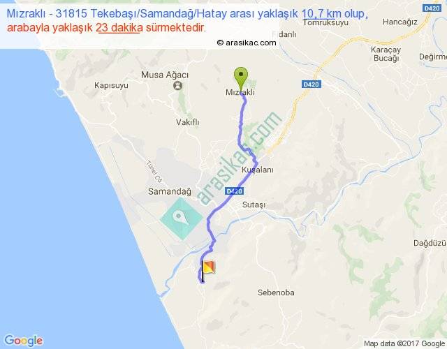 Mızraklı - 31815 Tekebaşı Samandağ Hatay arası yaklaşık olarak 90 km/h ile yukarıda belirtilen sürede olup, iki yerin kuş uçuşu uzaklığı (mesafesi) 8'dir. Yolculuk otobüsle 29 dakika sürmektedir.