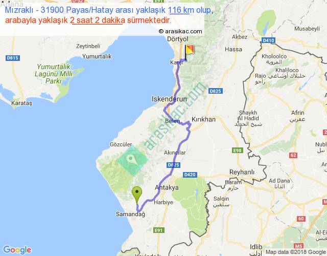 Mızraklı - 31900 Payas Hatay arası yaklaşık olarak 90 km/h ile yukarıda belirtilen sürede olup, iki yerin kuş uçuşu uzaklığı (mesafesi) 73'dir. Yolculuk otobüsle 2 saat 38 dakika sürmektedir.
