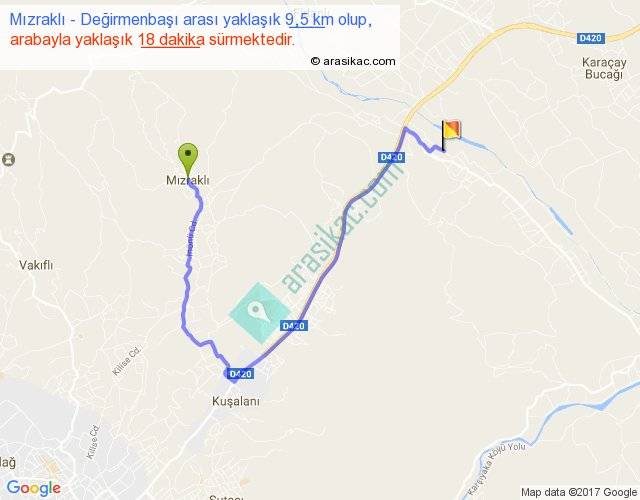 Mızraklı - Değirmenbaşı arası yaklaşık olarak 90 km/h ile yukarıda belirtilen sürede olup, iki yerin kuş uçuşu uzaklığı (mesafesi) 4'dir. Yolculuk otobüsle 23 dakika sürmektedir.