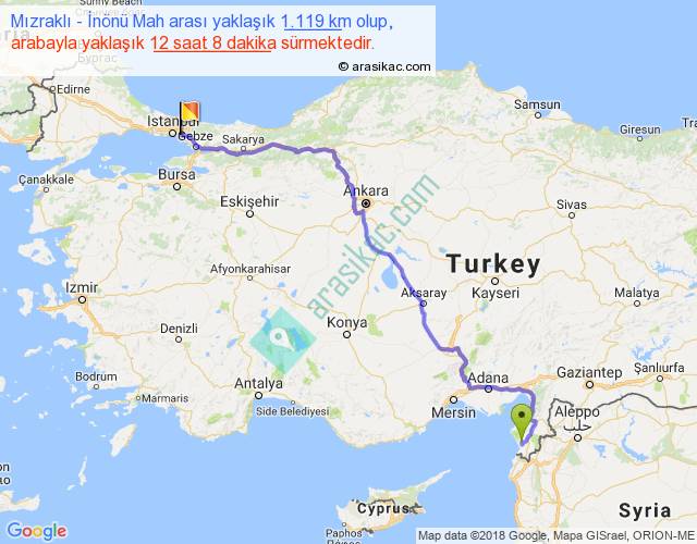 Mızraklı - İnönü Mah arası yaklaşık olarak 90 km/h ile yukarıda belirtilen sürede olup, iki yerin kuş uçuşu uzaklığı (mesafesi) 798'dir. Eğer belirtilen yerler arasında uçak seferi var ise bu süre uçakla 1 saat 13 dakika'ya kadar düşebilir. Yolculuk otobüsle 15 saat 46 dakika sürmektedir.