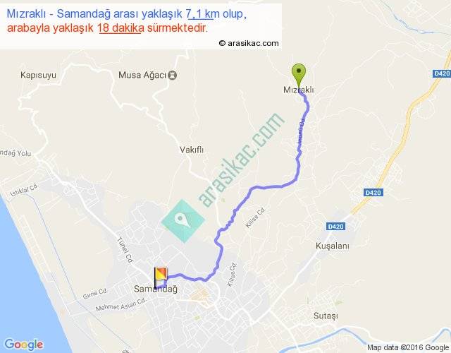 Mızraklı - Samandağ arası yaklaşık olarak 90 km/h ile yukarıda belirtilen sürede olup, iki yerin kuş uçuşu uzaklığı (mesafesi) 5'dir. Yolculuk otobüsle 23 dakika sürmektedir.