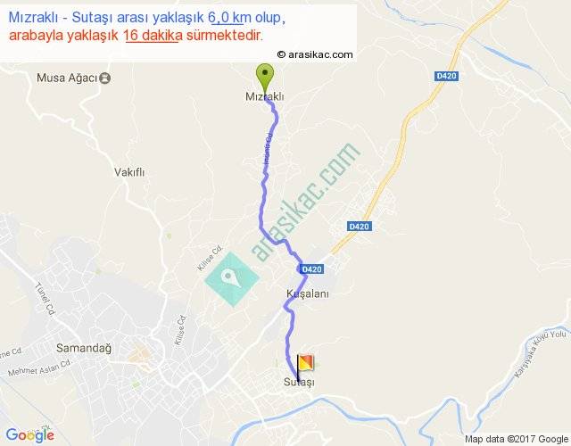 Mızraklı - Sutaşı arası yaklaşık olarak 90 km/h ile yukarıda belirtilen sürede olup, iki yerin kuş uçuşu uzaklığı (mesafesi) 5'dir. Yolculuk otobüsle 20 dakika sürmektedir.
