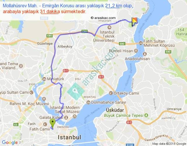 Mollahüsrev Mah. - Emirgân Korusu arası yaklaşık olarak 90 km/h ile yukarıda belirtilen sürede olup, iki yerin kuş uçuşu uzaklığı (mesafesi) 13'dir. Yolculuk otobüsle 40 dakika sürmektedir.