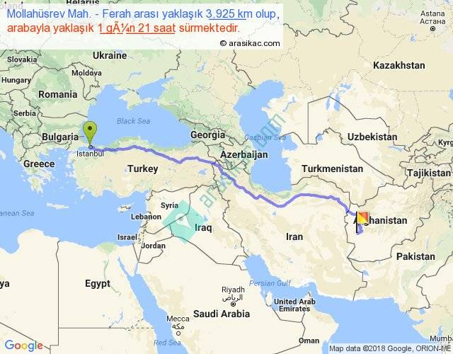 Mollahüsrev Mah. - Ferah arası yaklaşık olarak 90 km/h ile yukarıda belirtilen sürede olup, iki yerin kuş uçuşu uzaklığı (mesafesi) 3068'dir. Eğer belirtilen yerler arasında uçak seferi var ise bu süre uçakla 4 saat 43 dakika'ya kadar düşebilir. Yolculuk otobüsle 2 gün 10 saat sürmektedir.
