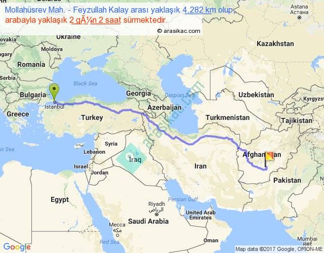 Mollahüsrev Mah. - Feyzullah Kalay arası yaklaşık olarak 90 km/h ile yukarıda belirtilen sürede olup, iki yerin kuş uçuşu uzaklığı (mesafesi) 3382'dir. Eğer belirtilen yerler arasında uçak seferi var ise bu süre uçakla 5 saat 12 dakika'ya kadar düşebilir. Yolculuk otobüsle 2 gün 17 saat sürmektedir.