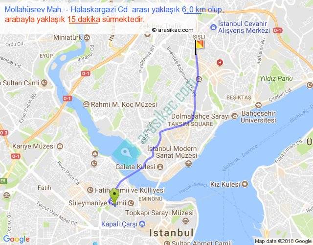 Mollahüsrev Mah. - Halaskargazi Cd. arası yaklaşık olarak 90 km/h ile yukarıda belirtilen sürede olup, iki yerin kuş uçuşu uzaklığı (mesafesi) 5'dir. Yolculuk otobüsle 19 dakika sürmektedir.