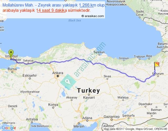 Mollahüsrev Mah. - Zeyrek arası yaklaşık olarak 90 km/h ile yukarıda belirtilen sürede olup, iki yerin kuş uçuşu uzaklığı (mesafesi) 1011'dir. Eğer belirtilen yerler arasında uçak seferi var ise bu süre uçakla 1 saat 33 dakika'ya kadar düşebilir. Yolculuk otobüsle 18 saat 23 dakika sürmektedir.