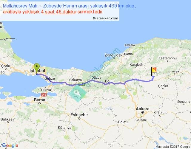 Mollahüsrev Mah. - Zübeyde Hanım arası yaklaşık olarak 90 km/h ile yukarıda belirtilen sürede olup, iki yerin kuş uçuşu uzaklığı (mesafesi) 354'dir. Eğer belirtilen yerler arasında uçak seferi var ise bu süre uçakla 32 dakika'ya kadar düşebilir. Yolculuk otobüsle 6 saat 11 dakika sürmektedir.