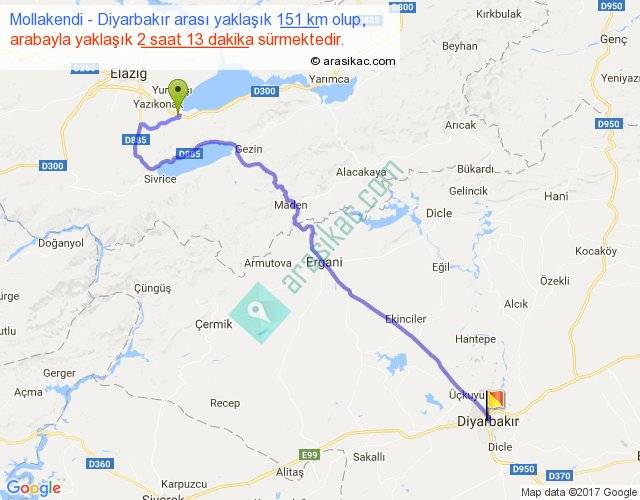 Mollakendi - Diyarbakır arası yaklaşık olarak 90 km/h ile yukarıda belirtilen sürede olup, iki yerin kuş uçuşu uzaklığı (mesafesi) 104'dir. Yolculuk otobüsle 2 saat 52 dakika sürmektedir.