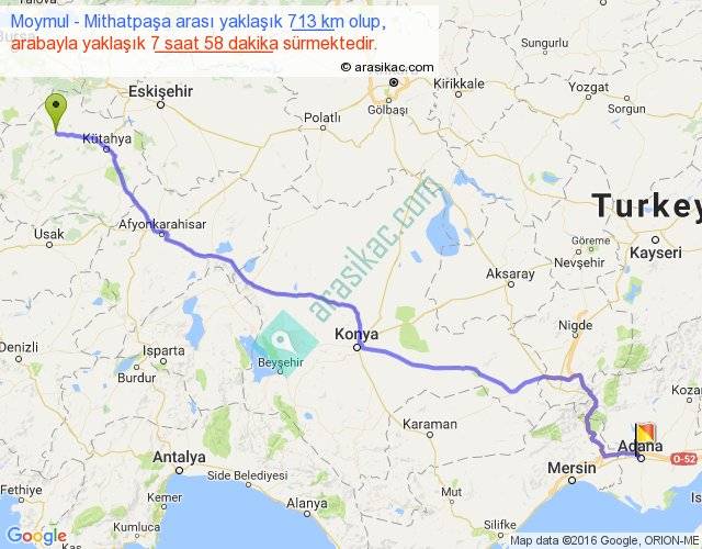 Moymul - Mithatpaşa arası yaklaşık olarak 90 km/h ile yukarıda belirtilen sürede olup, iki yerin kuş uçuşu uzaklığı (mesafesi) 578'dir. Eğer belirtilen yerler arasında uçak seferi var ise bu süre uçakla 53 dakika'ya kadar düşebilir. Yolculuk otobüsle 10 saat 21 dakika sürmektedir.