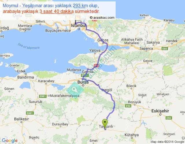 Moymul - Yeşilpınar arası yaklaşık olarak 90 km/h ile yukarıda belirtilen sürede olup, iki yerin kuş uçuşu uzaklığı (mesafesi) 176'dir. Yolculuk otobüsle 4 saat 46 dakika sürmektedir.