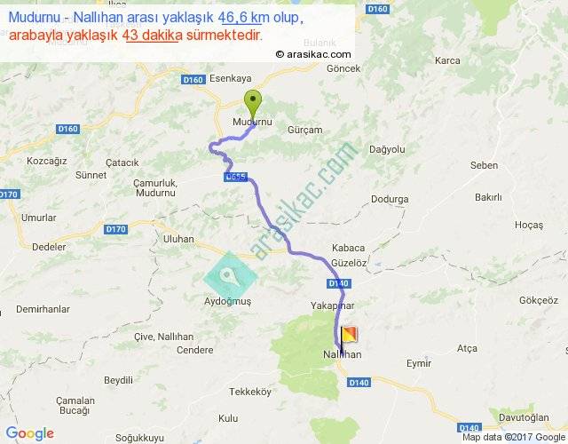 Mudurnu - Nallıhan arası yaklaşık olarak 90 km/h ile yukarıda belirtilen sürede olup, iki yerin kuş uçuşu uzaklığı (mesafesi) 32'dir. Yolculuk otobüsle 55 dakika sürmektedir.