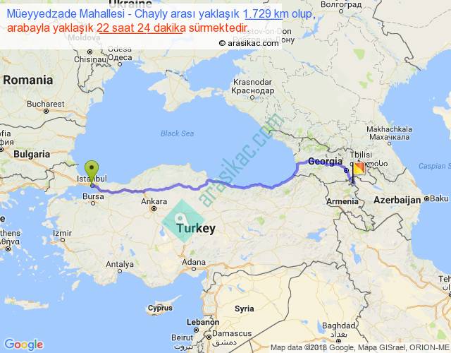 Müeyyedzade Mahallesi - Chayly arası yaklaşık olarak 90 km/h ile yukarıda belirtilen sürede olup, iki yerin kuş uçuşu uzaklığı (mesafesi) 1359'dir. Eğer belirtilen yerler arasında uçak seferi var ise bu süre uçakla 2 saat 05 dakika'ya kadar düşebilir. Yolculuk otobüsle 1 gün 5 saat sürmektedir.