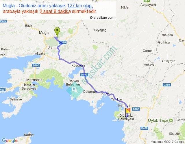 Muğla - Ölüdeniz arası yaklaşık olarak 90 km/h ile yukarıda belirtilen sürede olup, iki yerin kuş uçuşu uzaklığı (mesafesi) 89'dir. Yolculuk otobüsle 2 saat 46 dakika sürmektedir.