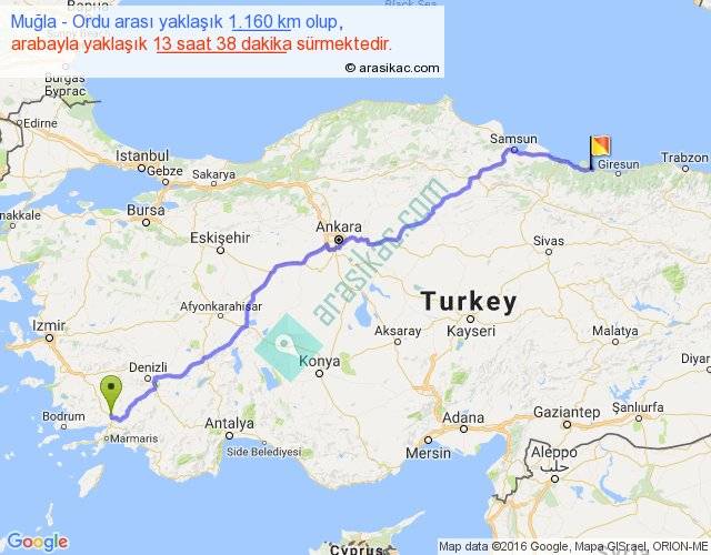 Muğla - Ordu arası yaklaşık olarak 90 km/h ile yukarıda belirtilen sürede olup, iki yerin kuş uçuşu uzaklığı (mesafesi) 916'dir. Eğer belirtilen yerler arasında uçak seferi var ise bu süre uçakla 1 saat 24 dakika'ya kadar düşebilir. Yolculuk otobüsle 17 saat 43 dakika sürmektedir.