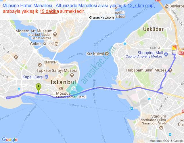 Muhsine Hatun Mahallesi - Altunizade Mahallesi arası yaklaşık olarak 90 km/h ile yukarıda belirtilen sürede olup, iki yerin kuş uçuşu uzaklığı (mesafesi) 7'dir. Yolculuk otobüsle 24 dakika sürmektedir.