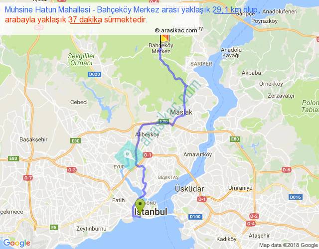 Muhsine Hatun Mahallesi - Bahçeköy Merkez arası yaklaşık olarak 90 km/h ile yukarıda belirtilen sürede olup, iki yerin kuş uçuşu uzaklığı (mesafesi) 20'dir. Yolculuk otobüsle 48 dakika sürmektedir.