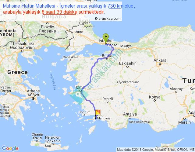 Muhsine Hatun Mahallesi - İçmeler arası yaklaşık olarak 90 km/h ile yukarıda belirtilen sürede olup, iki yerin kuş uçuşu uzaklığı (mesafesi) 469'dir. Eğer belirtilen yerler arasında uçak seferi var ise bu süre uçakla 43 dakika'ya kadar düşebilir. Yolculuk otobüsle 11 saat 14 dakika sürmektedir.