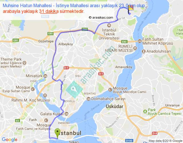 Muhsine Hatun Mahallesi - İstinye Mahallesi arası yaklaşık olarak 90 km/h ile yukarıda belirtilen sürede olup, iki yerin kuş uçuşu uzaklığı (mesafesi) 14'dir. Yolculuk otobüsle 40 dakika sürmektedir.