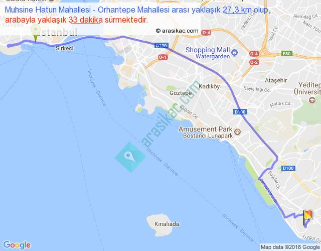 Muhsine Hatun Mahallesi - Orhantepe Mahallesi arası yaklaşık olarak 90 km/h ile yukarıda belirtilen sürede olup, iki yerin kuş uçuşu uzaklığı (mesafesi) 19'dir. Yolculuk otobüsle 42 dakika sürmektedir.