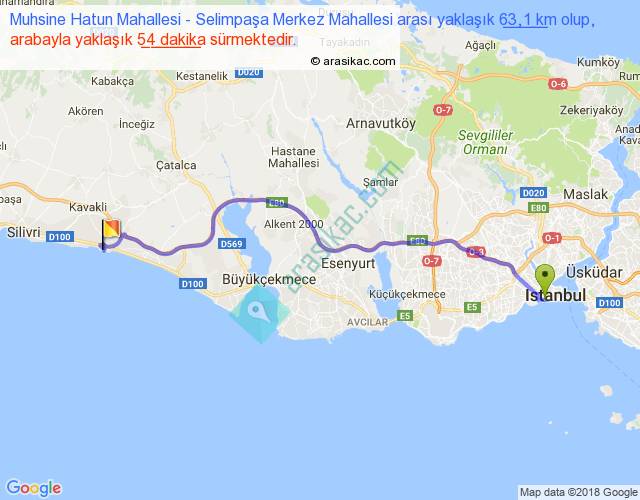 Muhsine Hatun Mahallesi - Selimpaşa Merkez Mahallesi arası yaklaşık olarak 90 km/h ile yukarıda belirtilen sürede olup, iki yerin kuş uçuşu uzaklığı (mesafesi) 51'dir. Yolculuk otobüsle 1 saat 10 dakika sürmektedir.