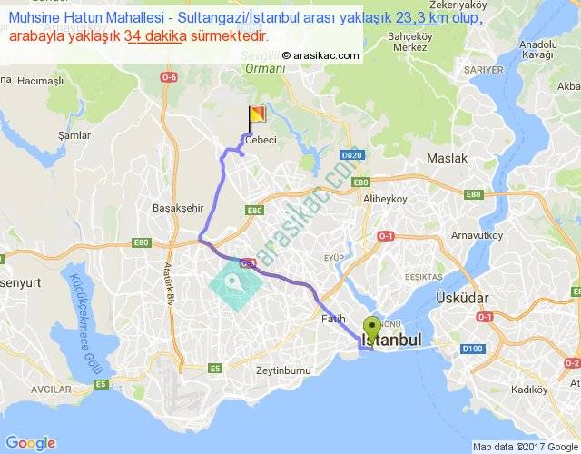 Muhsine Hatun Mahallesi - Sultangazi İstanbul arası yaklaşık olarak 90 km/h ile yukarıda belirtilen sürede olup, iki yerin kuş uçuşu uzaklığı (mesafesi) 16'dir. Yolculuk otobüsle 44 dakika sürmektedir.