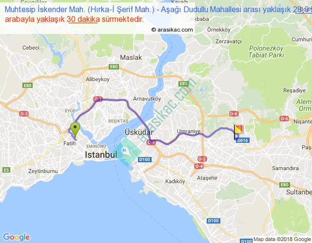 Muhtesip İskender Mah. (Hırka-İ Şerif Mah.) - Aşağı Dudullu Mahallesi arası yaklaşık olarak 90 km/h ile yukarıda belirtilen sürede olup, iki yerin kuş uçuşu uzaklığı (mesafesi) 19'dir. Yolculuk otobüsle 39 dakika sürmektedir.