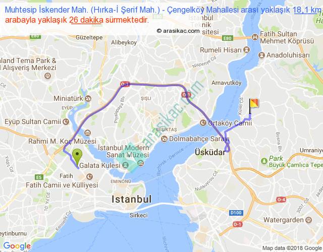Muhtesip İskender Mah. (Hırka-İ Şerif Mah.) - Çengelköy Mahallesi arası yaklaşık olarak 90 km/h ile yukarıda belirtilen sürede olup, iki yerin kuş uçuşu uzaklığı (mesafesi) 10'dir. Yolculuk otobüsle 33 dakika sürmektedir.
