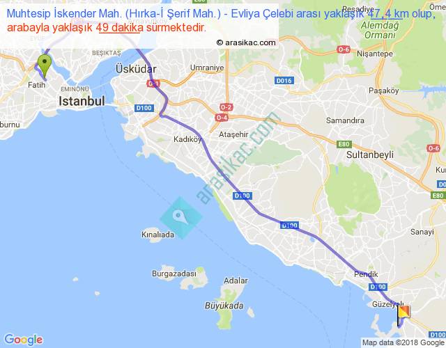 Muhtesip İskender Mah. (Hırka-İ Şerif Mah.) - Evliya Çelebi arası yaklaşık olarak 90 km/h ile yukarıda belirtilen sürede olup, iki yerin kuş uçuşu uzaklığı (mesafesi) 36'dir. Yolculuk otobüsle 1 saat 3 dakika sürmektedir.
