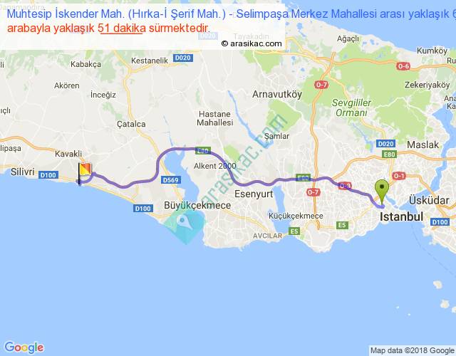 Muhtesip İskender Mah. (Hırka-İ Şerif Mah.) - Selimpaşa Merkez Mahallesi arası yaklaşık olarak 90 km/h ile yukarıda belirtilen sürede olup, iki yerin kuş uçuşu uzaklığı (mesafesi) 49'dir. Yolculuk otobüsle 1 saat 6 dakika sürmektedir.