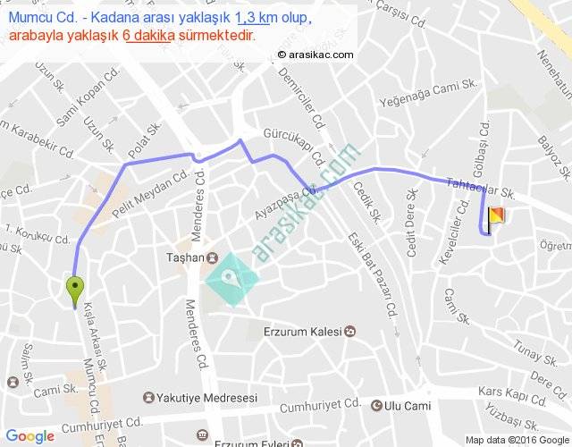 Mumcu Cd. - Kadana arası yaklaşık olarak 90 km/h ile yukarıda belirtilen sürede olup, iki yerin kuş uçuşu uzaklığı (mesafesi) 1'dir. Yolculuk otobüsle 7 dakika sürmektedir.
