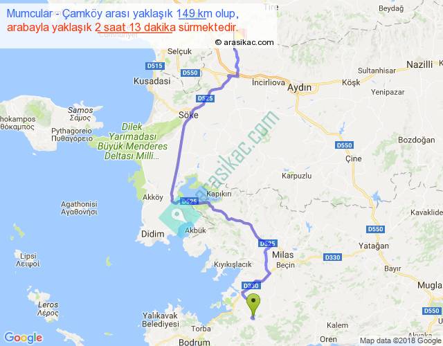 Mumcular - Çamköy arası yaklaşık olarak 90 km/h ile yukarıda belirtilen sürede olup, iki yerin kuş uçuşu uzaklığı (mesafesi) 94'dir. Yolculuk otobüsle 2 saat 52 dakika sürmektedir.