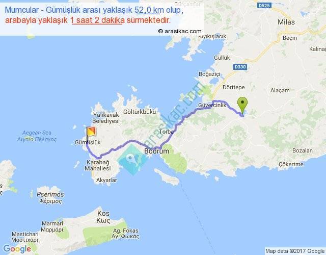 Mumcular - Gümüşlük arası yaklaşık olarak 90 km/h ile yukarıda belirtilen sürede olup, iki yerin kuş uçuşu uzaklığı (mesafesi) 37'dir. Yolculuk otobüsle 1 saat 20 dakika sürmektedir.