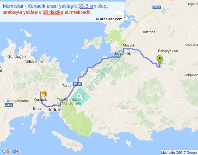 Mumcular - Konacık arası yaklaşık olarak 90 km/h ile yukarıda belirtilen sürede olup, iki yerin kuş uçuşu uzaklığı (mesafesi) 24'dir. Yolculuk otobüsle 49 dakika sürmektedir.