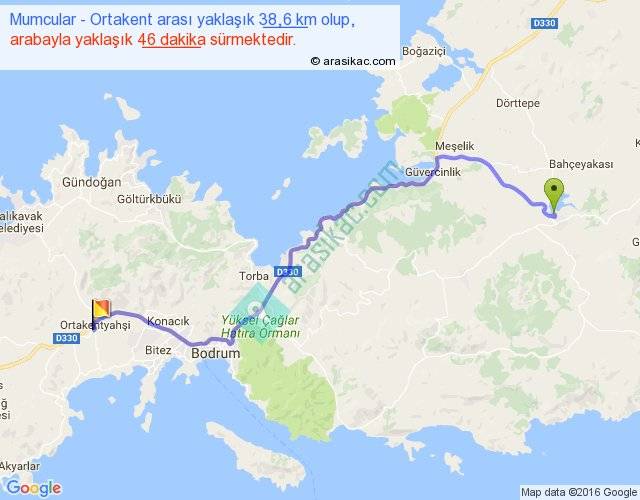 Mumcular - Ortakent arası yaklaşık olarak 90 km/h ile yukarıda belirtilen sürede olup, iki yerin kuş uçuşu uzaklığı (mesafesi) 29'dir. Yolculuk otobüsle 59 dakika sürmektedir.