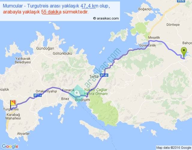 Mumcular - Turgutreis arası yaklaşık olarak 90 km/h ile yukarıda belirtilen sürede olup, iki yerin kuş uçuşu uzaklığı (mesafesi) 36'dir. Yolculuk otobüsle 1 saat 11 dakika sürmektedir.